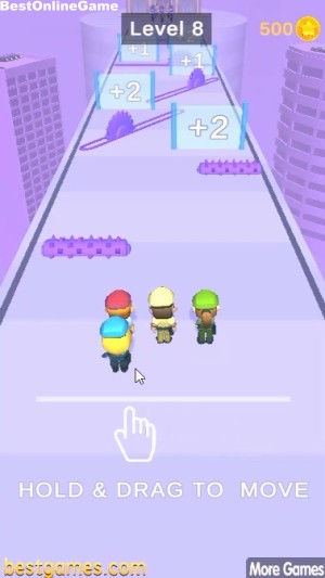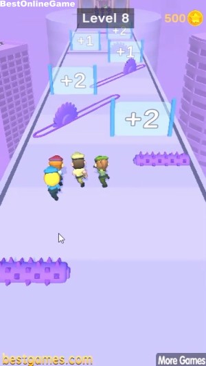 トゲのついたトラップや回転する歯車にあたると仲間が減っていきます。「+2」などのゲートを通過すると仲間が増えます