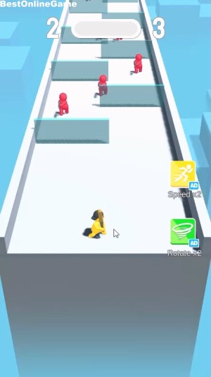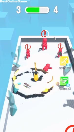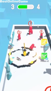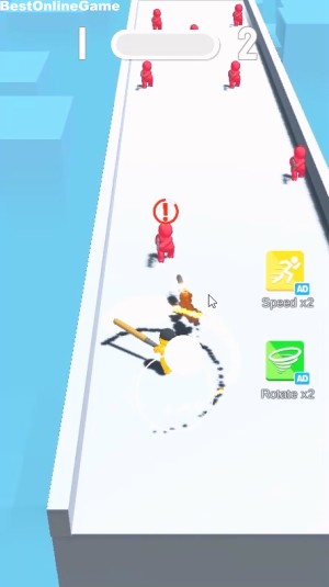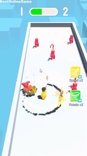 開始後、画面をドラッグしてバットを振り回すキャラクターを操作して、敵の銃の弾を跳ね返して倒したり、直接攻撃して敵を倒していきます