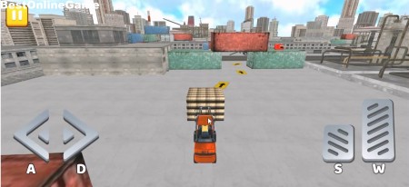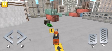 開始後、画面のボタンかWASDで車を操作して目的地を目指します。まずはフォークリストを操作して矢印の方向へと進んでいきます