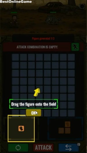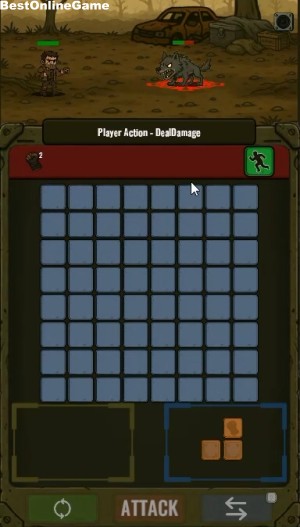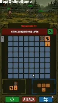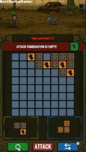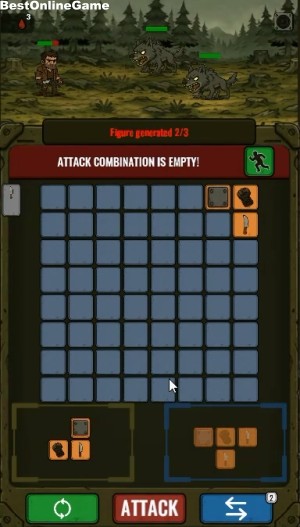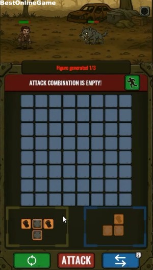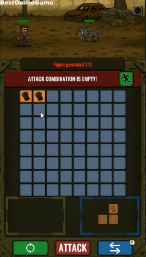 マスにテトリスブロックに描かれた手、ナイフ、銃などの同じ絵柄を2つ以上縦横にセットして敵を攻撃して敵を倒してマップの各エリアのクリアを目指します