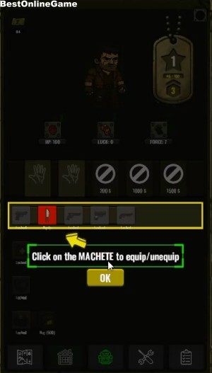 最初のレベルをクリアすると、新たな武器のマチェットを獲得できます。持ち物を開いてい武器をセットします