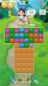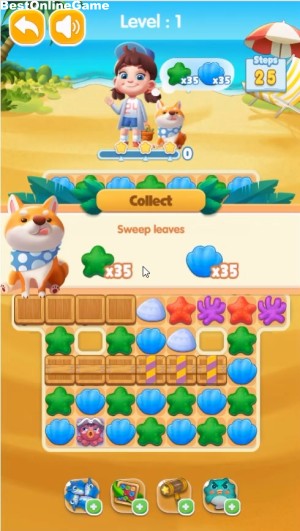 レベル1では、25回以内の移動で、緑の星を35個、青い貝を35個消してクリアを目指します
