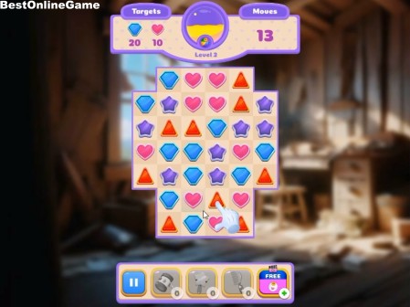 レベル2では、青の絵柄を20個、ハートを10個、13回以内の移動で消してクリアします