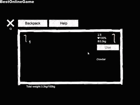 次に、「Q」キーで持ち物を開き、「Use」ボタンでバールを手で持ちます