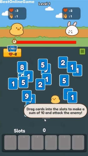 EASYモードでは、合計が10になるように、画面内のカードを画面下のスロットに入れて消し、敵にダメージを与えてレベルをクリアしていきます
