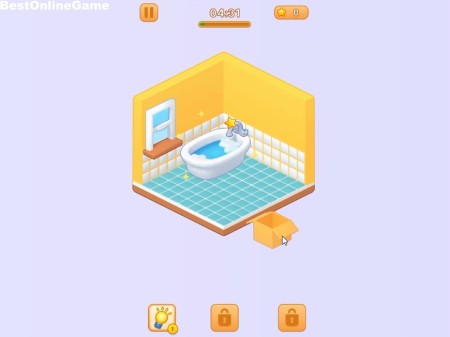 レベル1は、バスルームです。最初の練習と同じように、段ボールから出てくるアイテムを正しい場所へ設置してクリアを目指します