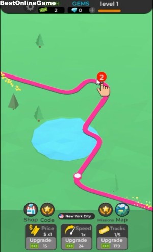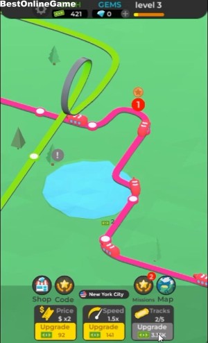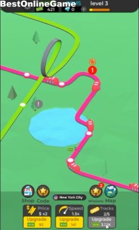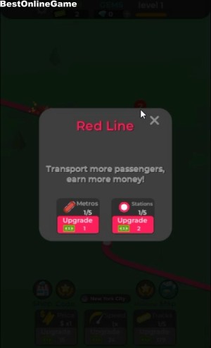 クリックすると、赤い線路をアップグレードしていきます。通過する乗り物の数と駅をまずは、5個の追加を目指します