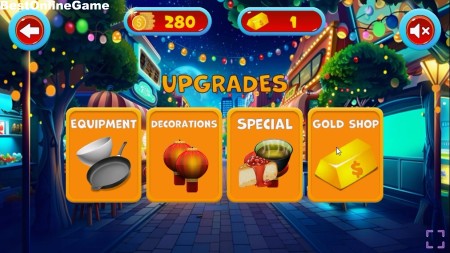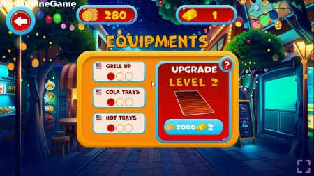 EQUIPMENTSでは、ワゴン内の装備をアップグレードすることができます。グリル、コーラトレイ、ホットトレイの3箇所を獲得したコインと金塊でアップグレードして、より素早くお客に商品を提供することができます