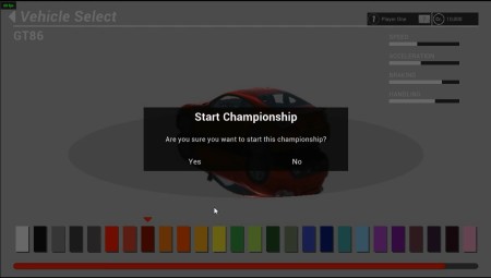 GT86をクリック後、カラー選択画面で車の色を決めて、YESを押してスタートとなります