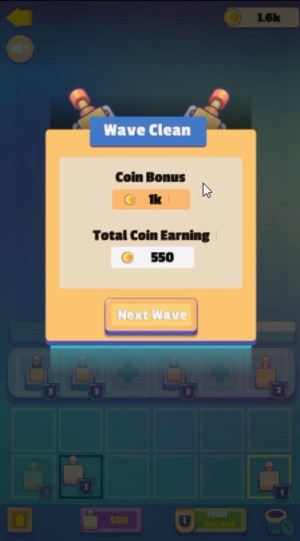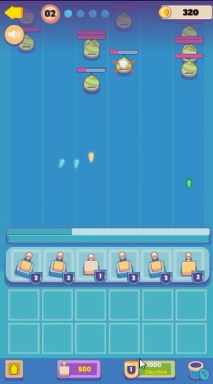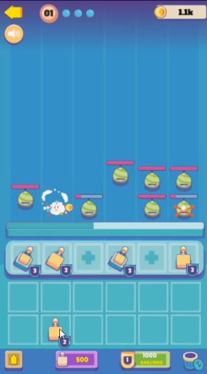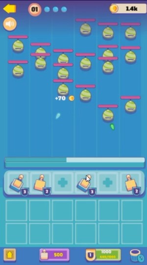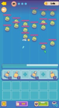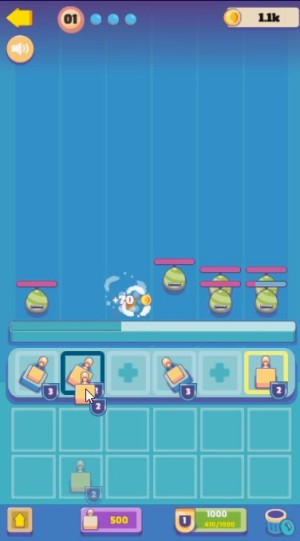 開始後、画面下からコインを利用して攻撃ユニットをマスに作成します。同じレベルのものを合体させて、レベルアップさせていきます