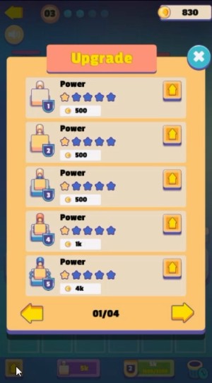 ボーナスコインで次のレベル開始前に、新たに攻撃ユニットを作成するか、画面左下の矢印を押してアップグレード画面を表示されて、各レベルのタワーをコインで威力をアップグレードすることができます