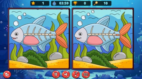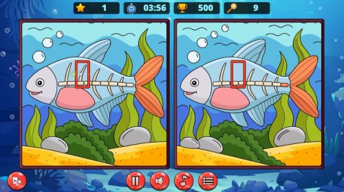ゲームは、海がテーマの魚やイルカの絵から左右の絵を見比べて各レベルの制限時間内にすべての間違いを見つけてレベルをクリアしていく間違い探しです