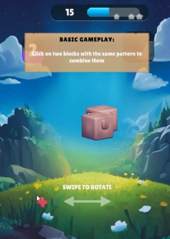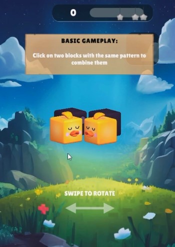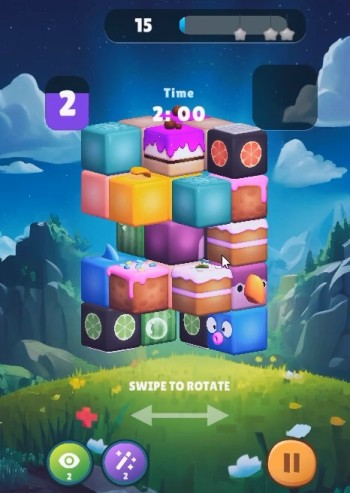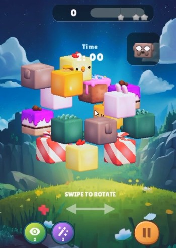 開始後、3Dの立体キューブに描かれた同じ色の絵柄を選択して消していきます