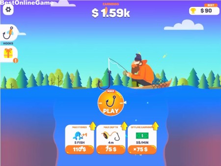 ゲームは、ボールに乗った釣り人の釣り竿から水中に落とされる釣り針を操作し魚を引っ掛けて釣り上げお金を貯めて魚の数と深さなどをアップグレードしていくフィッシングゲームです